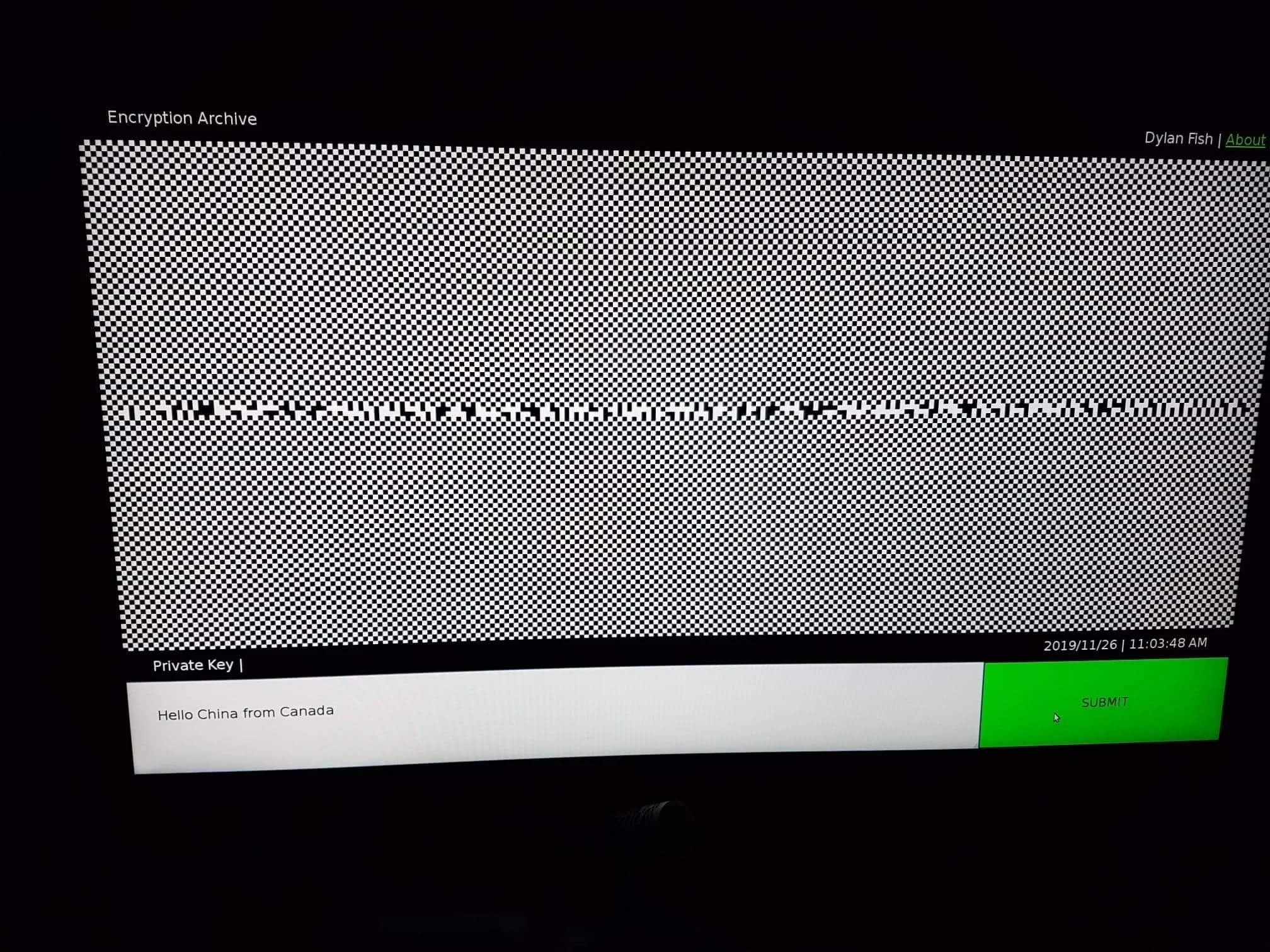 The website was set up as an interactive component, encouraging viewers to submit encrypted messages to the data base over the course of the exhibition. Upon submitting a message to the site, one copy of their encrypted message was stored on the backend of the site and one copy was printed out as a receipt for viewers to take.