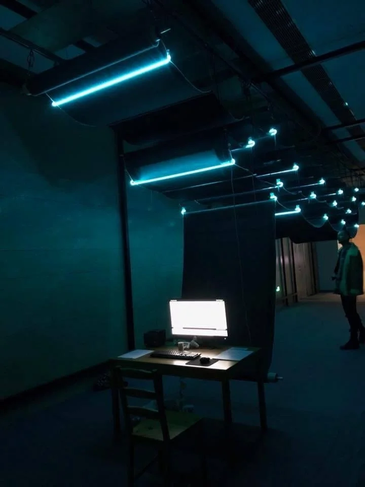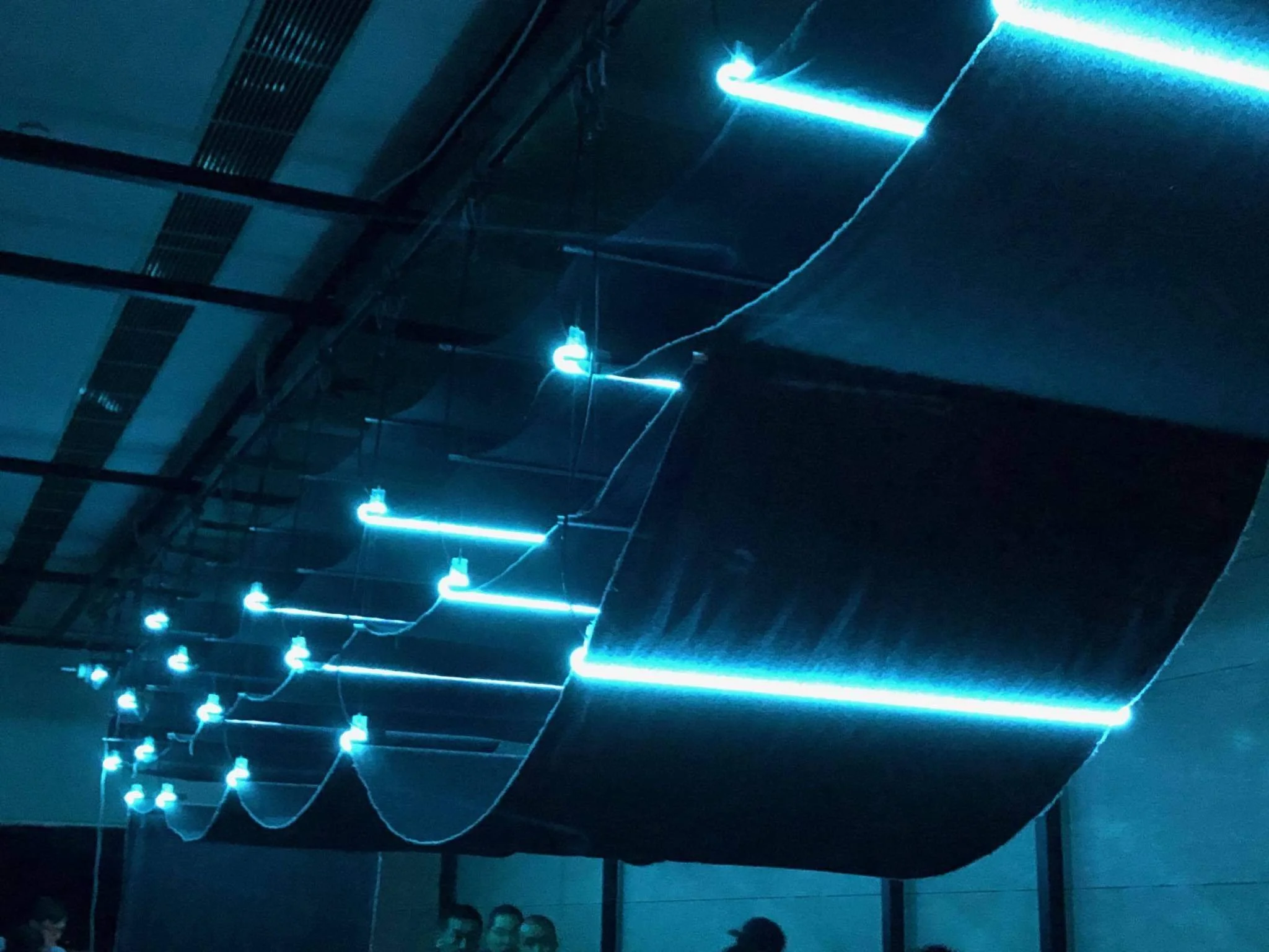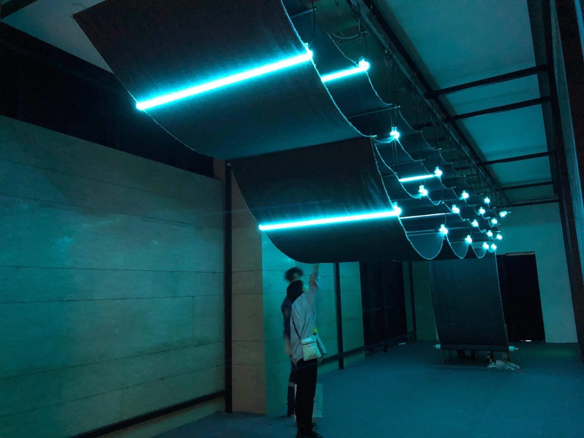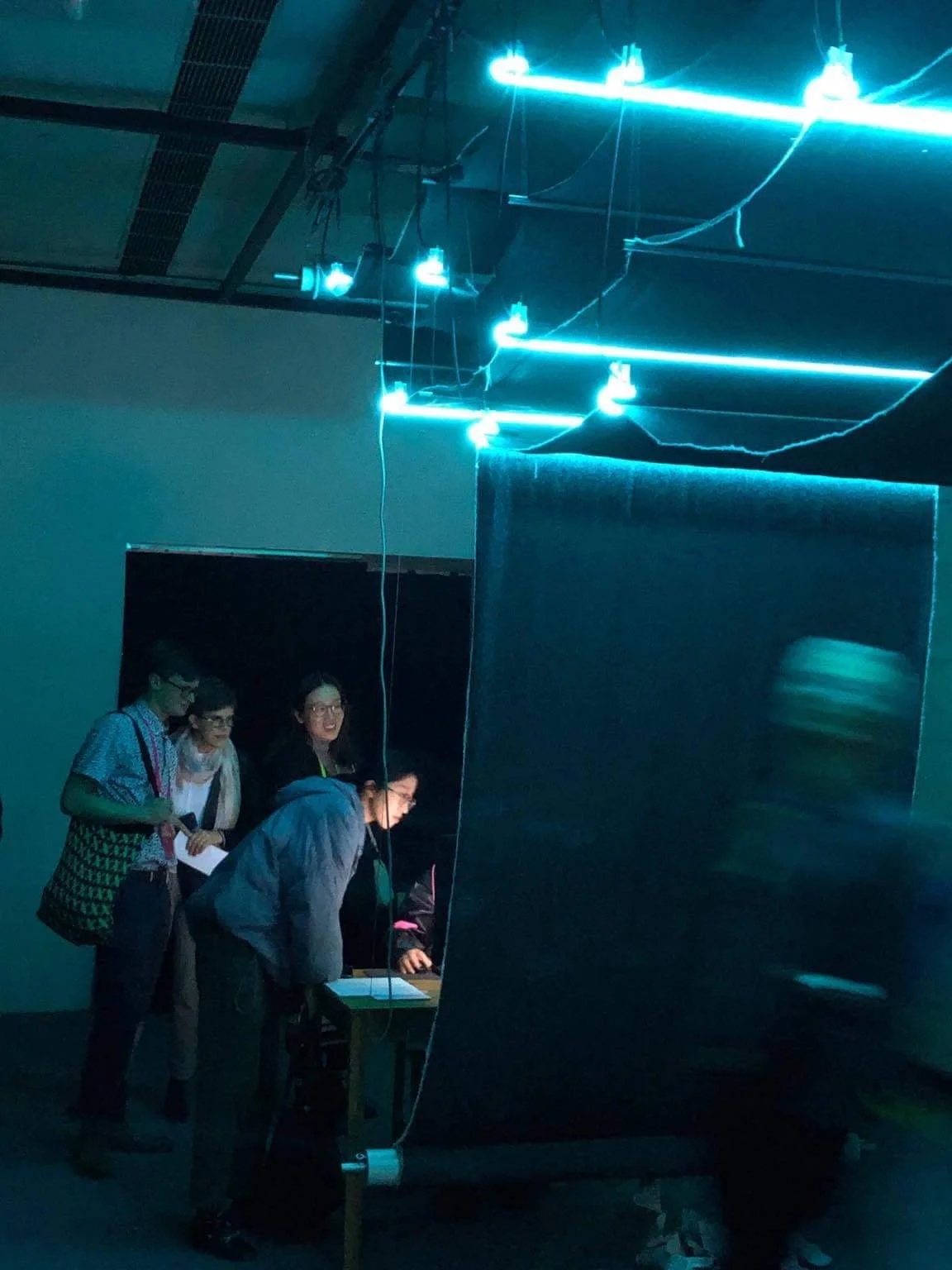 The neon lights blink private key numbers in morse code periodically over the course of the exhibition. These numbers are needed to decrypt the information that has been hard coded and stored into the structure of the cloth.