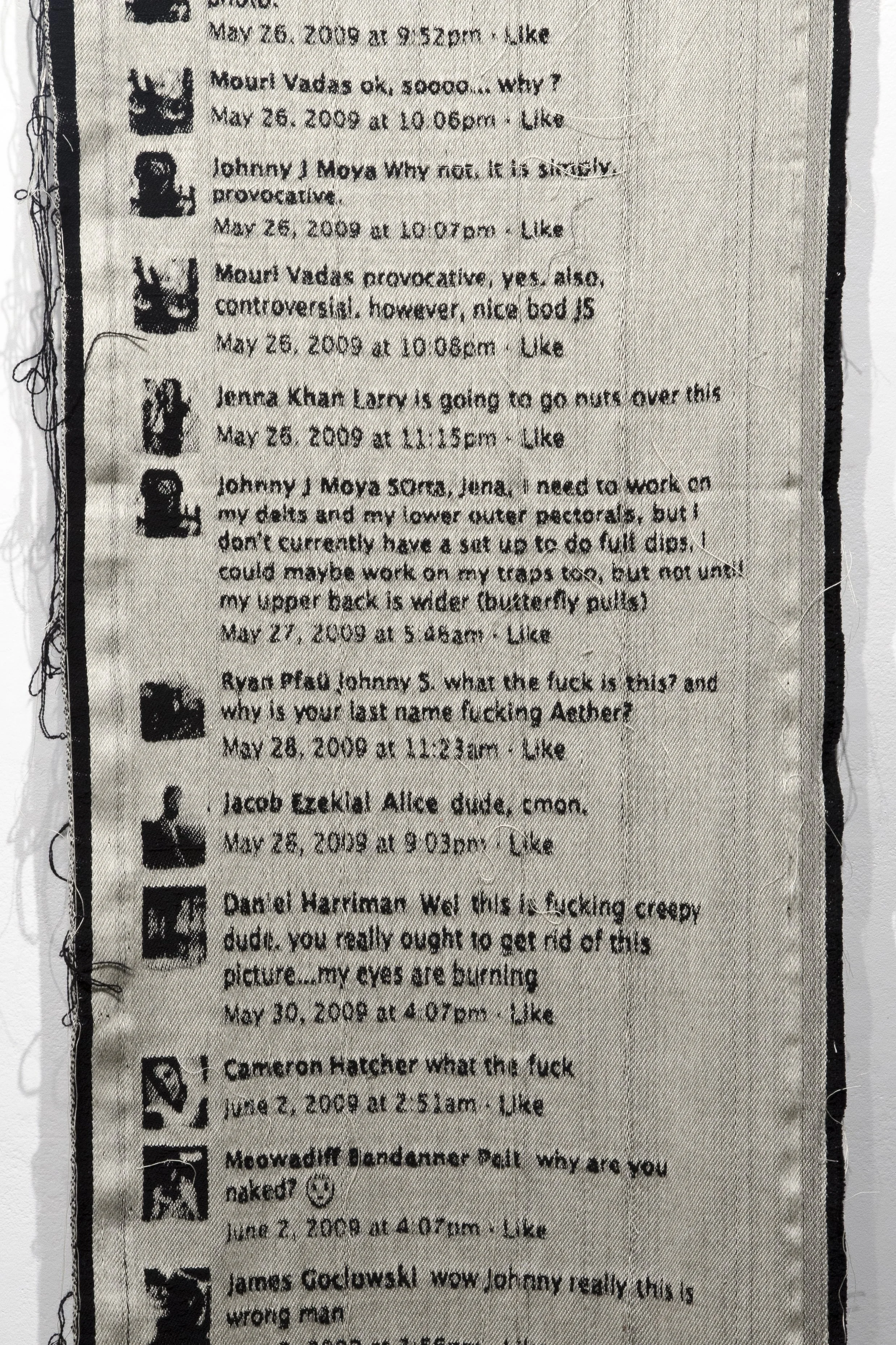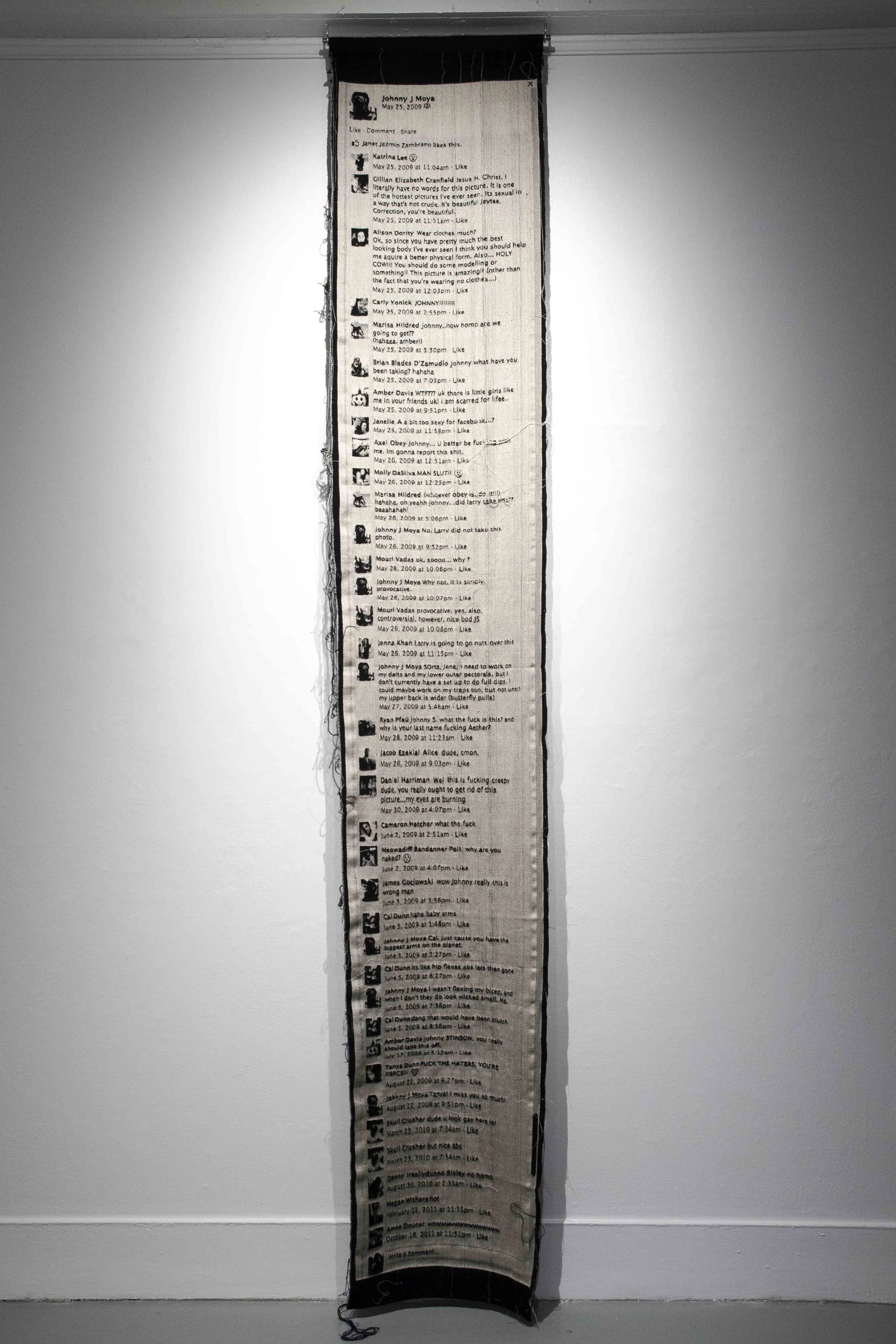 Social Fabric is a body of work that depicts the excessive overshare culture of Facebook and other social media platforms using handwoven Jacquard cloth.